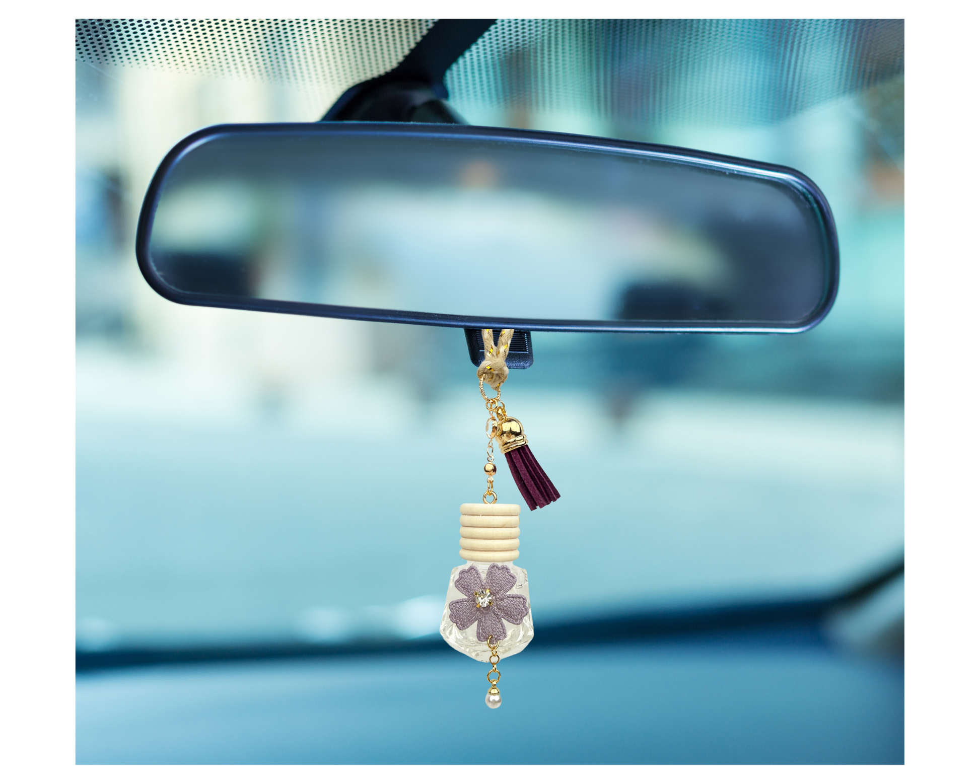 Add a touch of charm to your space with our Hanging Diffuser! This 8ml glass bottle features a reed cap, a soft purple fabric flower, a tiny pearl, and a matching purple faux leather tassel, giving it a delicate and whimsical look. Infused with our toxin-free Bohemian Rose scent, it fills your space with a romantic blend of fresh roses and warm, musky undertones. The fragrance lasts 1-2 months, though warmer temperatures may speed up diffusion. Simply hang, tilt to soak the cap, and enjoy a lovely floral aroma in your car, closet, or any small space!